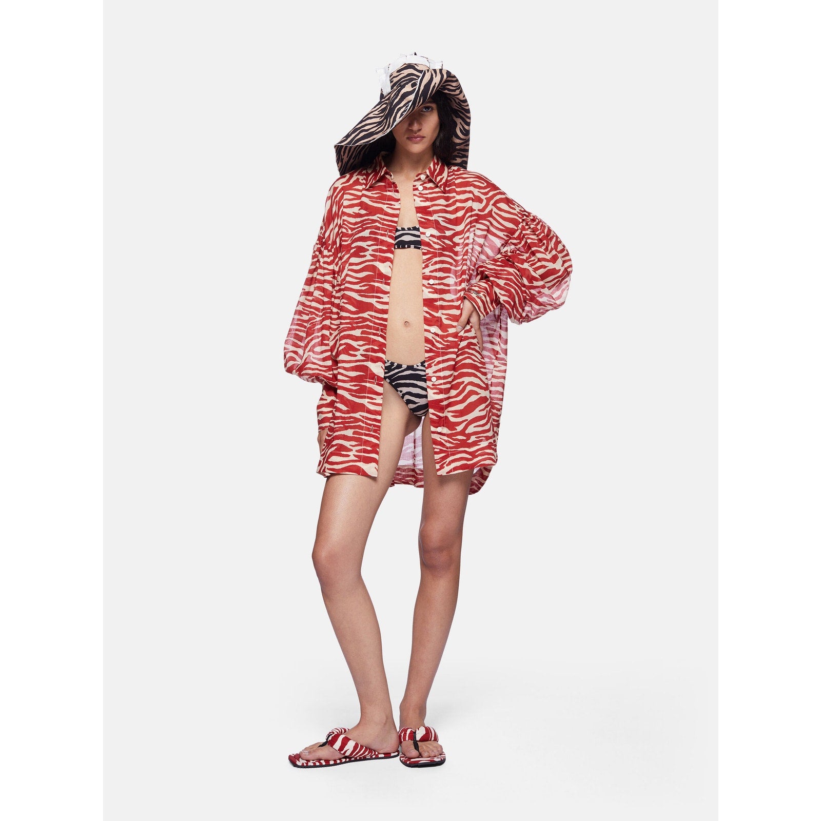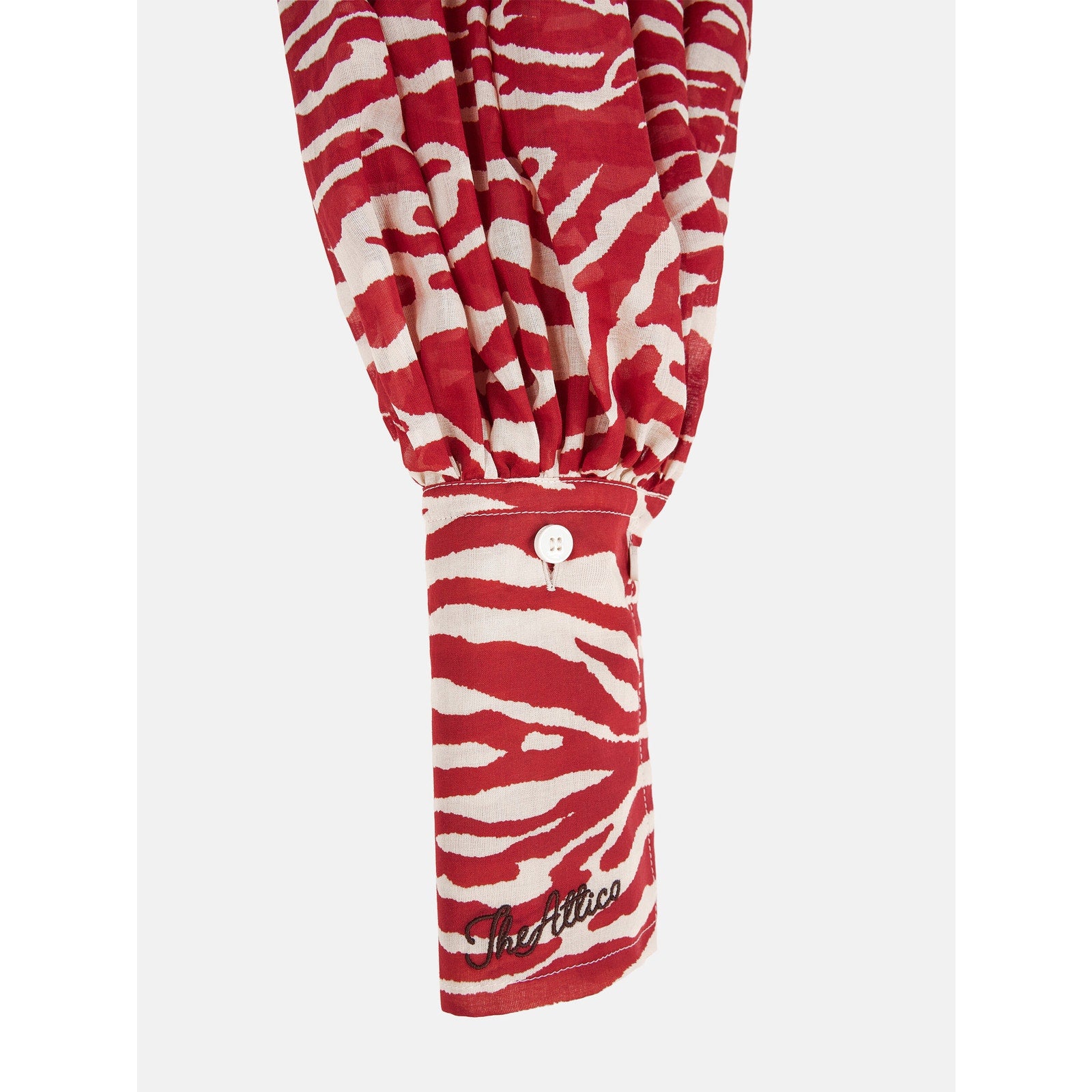 A striking oversized shirt from The Attico, crafted in airy cotton mousseline with a bold red-and-milk zebra print. Wide sleeves add a dramatic silhouette, while an embroidered logo detail completes this luxe statement piece. Made in Italy, it’s perfect styled loose over trousers or tucked for an elevated look.